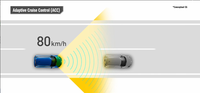 Khi công tắc ACC trên vô lăng được bật trong giao thông, hệ thống sử dụng radar và camera để đo khoảng cách đến xe phía trước và sẽ tăng tốc hoặc giảm tốc khi cần thiết để duy trì khoảng cách đã đặt. Nếu đường phía trước thông thoáng, hệ thống sẽ duy trì tốc độ xe đang di chuyển khi công tắc được bật