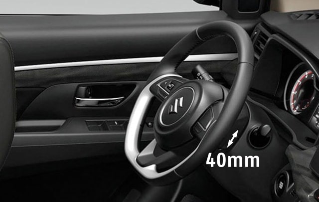 Tay lái hình chữ D giúp tăng chỗ để chân và ra vào ghế lái dễ dàng. Ngoài ra vô lăng có thể điều chỉnh độ nghiêng lên tới 40mm